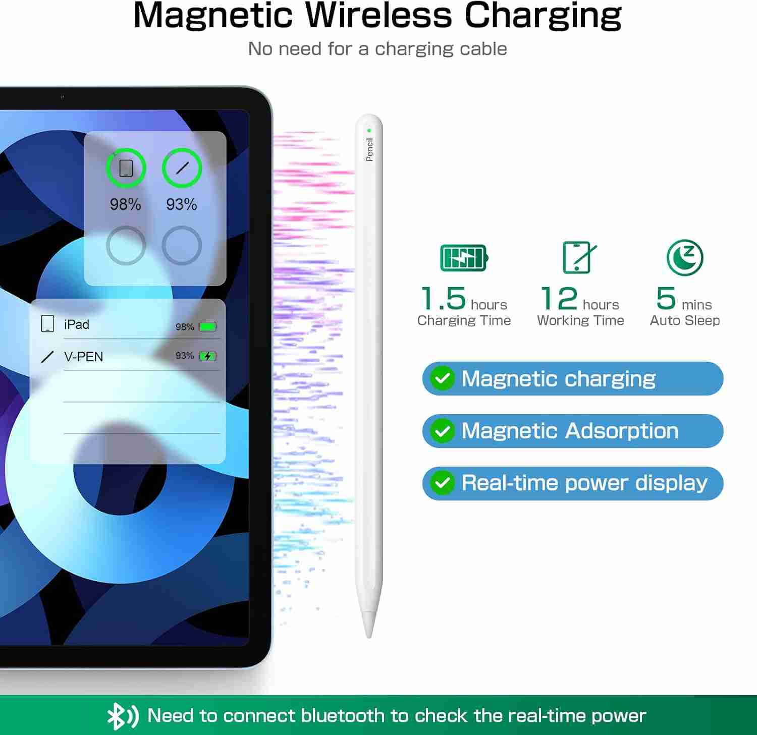 • Without the charging cable design, magnetically attach to the side of the iPad and wirelessly charge at any time.