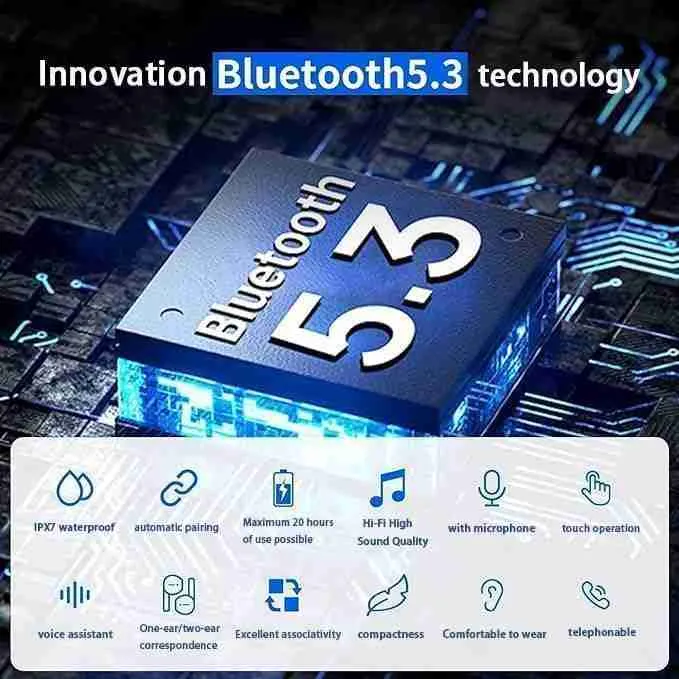 1、Bluetooth 5.3 Bluetooth 5.3 headphones, open the cover to connect! After connecting manually for the first time and when you start it up again, open the cover and it will automatically switch on and connect to the last connected device automatically, saving your waiting time. 2、Hi-Fi sound quality Featuring Hi-Fi high quality graphene dynamic drivers for crisp, clear sound. 3、Outstanding ENC noise cancellation Industry-leading ENC noise cancellation technology instantly puts you in your own world. 4、Compatible with a wide range of devices Android IOS Windows/Mac Compatible with virtually any Bluetooth-equipped device. 5、Extra-long battery life The headphones provide up to 6 hours of playback on their own, and an additional 48 hours when used with the charging case. 6、Highly sensitive touch buttons High-sensitivity touch operation for music play/pause, song forward/backward, volume adjustment, Siri/Google Assistant and other operations. 7、Compact size and comfortable to wear 4g ultra-lightweight design, comfortable to wear, not easy to fall off, very convenient to carry. 8、IPX7 waterproof and sweatproof performance Enjoy your music with peace of mind even when dancing and sweating.