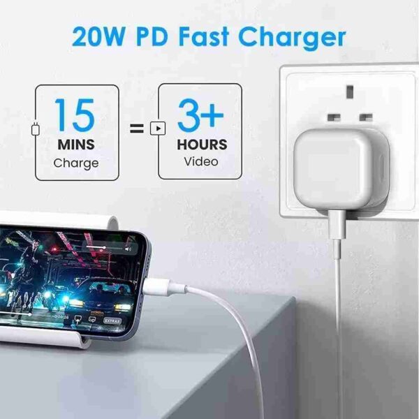 - 【What You Get】1 × 20W Fast Charging Plug, 1 × 1M USB C to Lightning Charging Cable.
