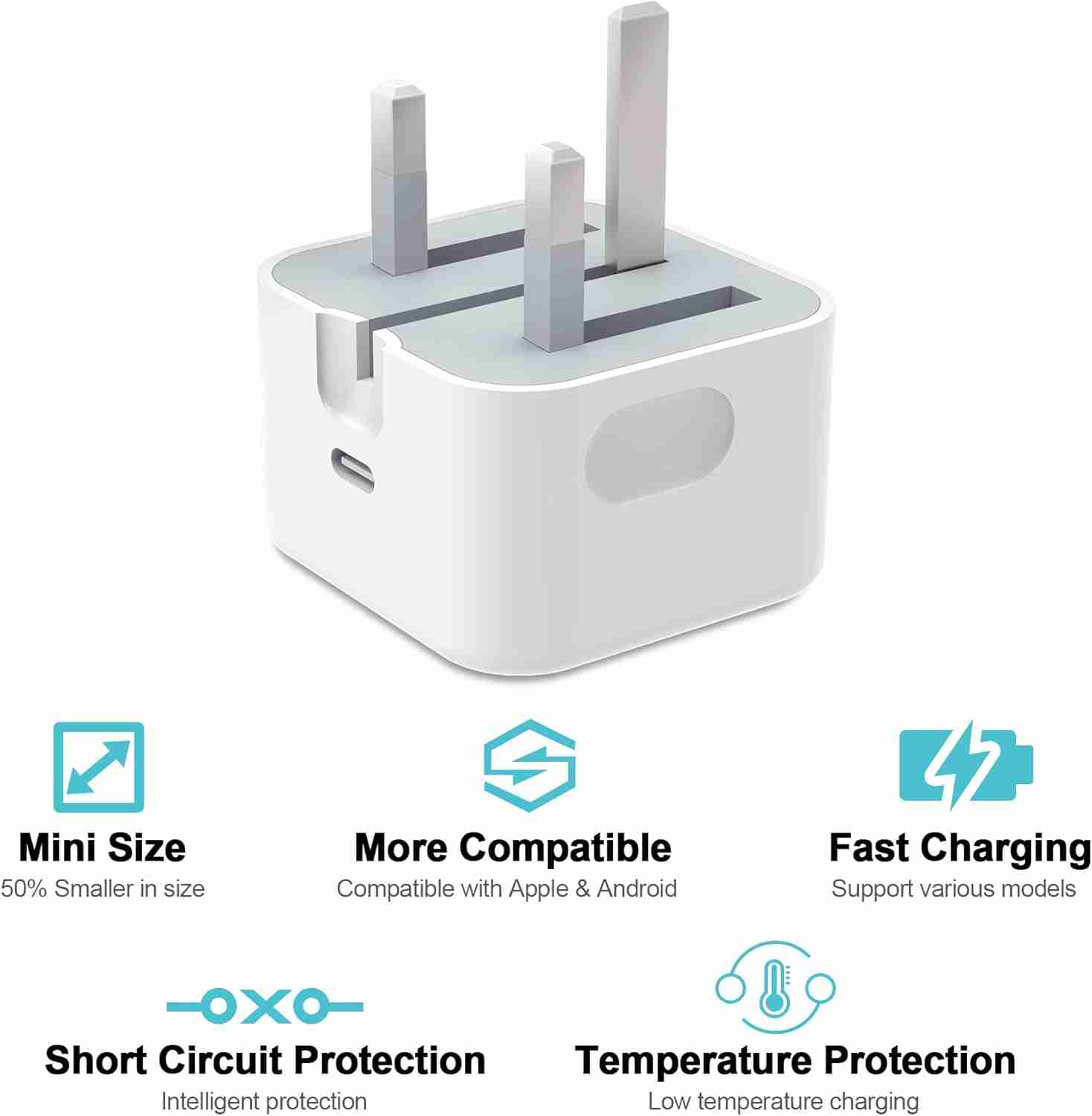 - 【What You Get】1 × 20W Fast Charging Plug, 1 × 1M USB C to Lightning Charging Cable.