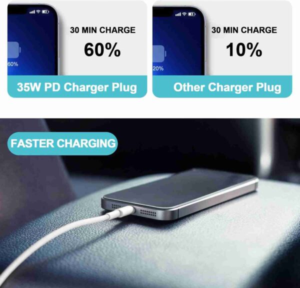 - 【What You Get】1 × 35W Fast Charging Plug, 1 × 1M USB C to Lightning Charging Cable.