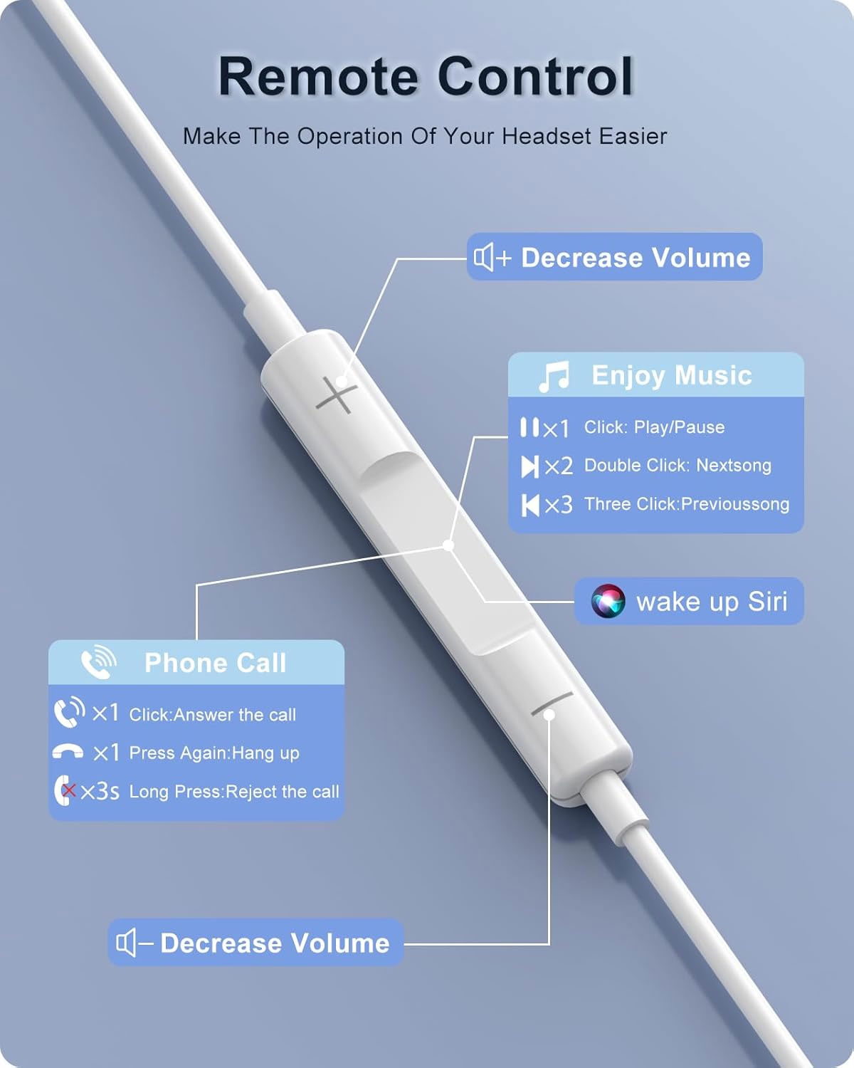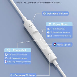 - 【Multi-Function Button】: Our iPhone headphones have built-in microphone and volume control, equipped with a high-quality hands-free microphone. Music and volume controls are designed to play/pause music, increase/decrease volume, skip to next and previous track, answer/end calls, wake up Siri. During these operations, there is no need to remove the phone from a bag or pocket, freeing up your hands.